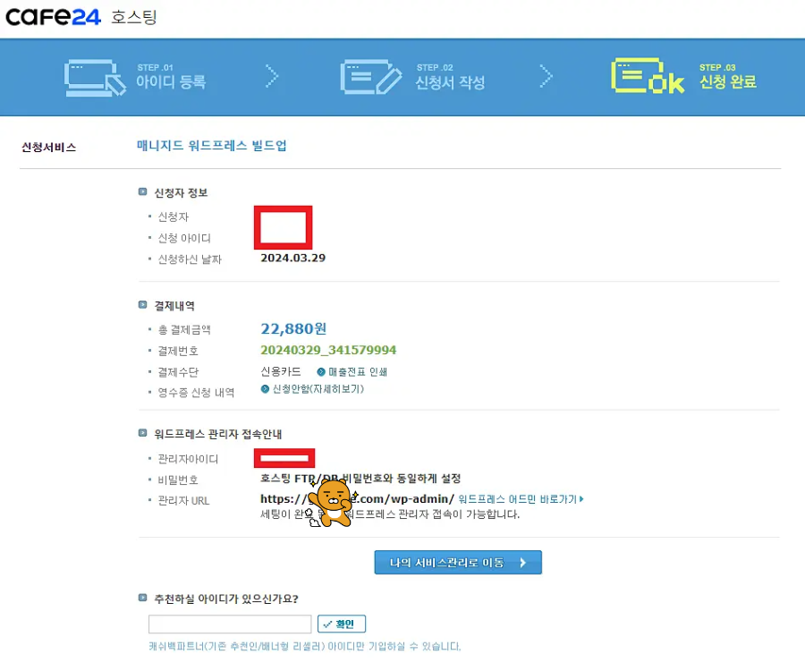 여기서 만든 신청 아이디와 비밀번호가 워드프레스 관리페이지로 들어가기 위한 아이디, 패스워드가 됩니다. 꼭 기억하고 있어야 합니다.