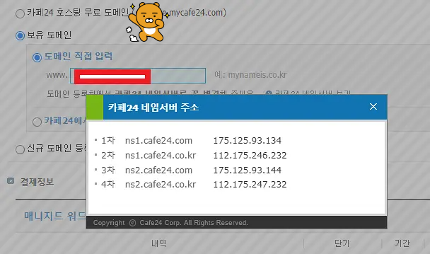 도메인은 보유도메인을 선택하고 "카페24 네임서버 보기"를 선택 후 네임서버 주소를 확인합니다.