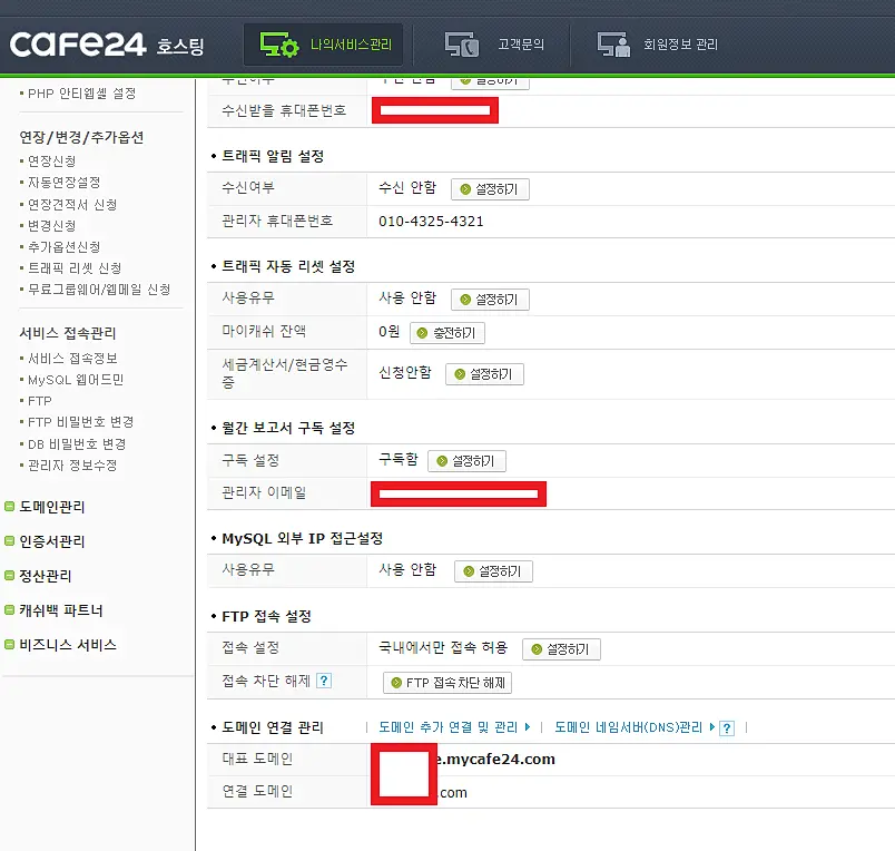 대표 도메인이 ???.mycafe24.com으로 되어 있는 것을 가비아에서 구매한 ???.com 도메인으로 변경해 보겠습니다.