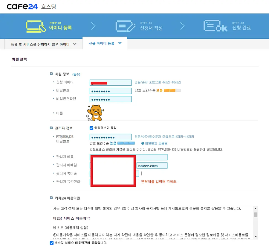 여기서 만든 신청 아이디와 비밀번호가 워드프레스 관리페이지로 들어가기 위한 아이디, 패스워드가 됩니다. 꼭 기억하고 있어야 합니다.