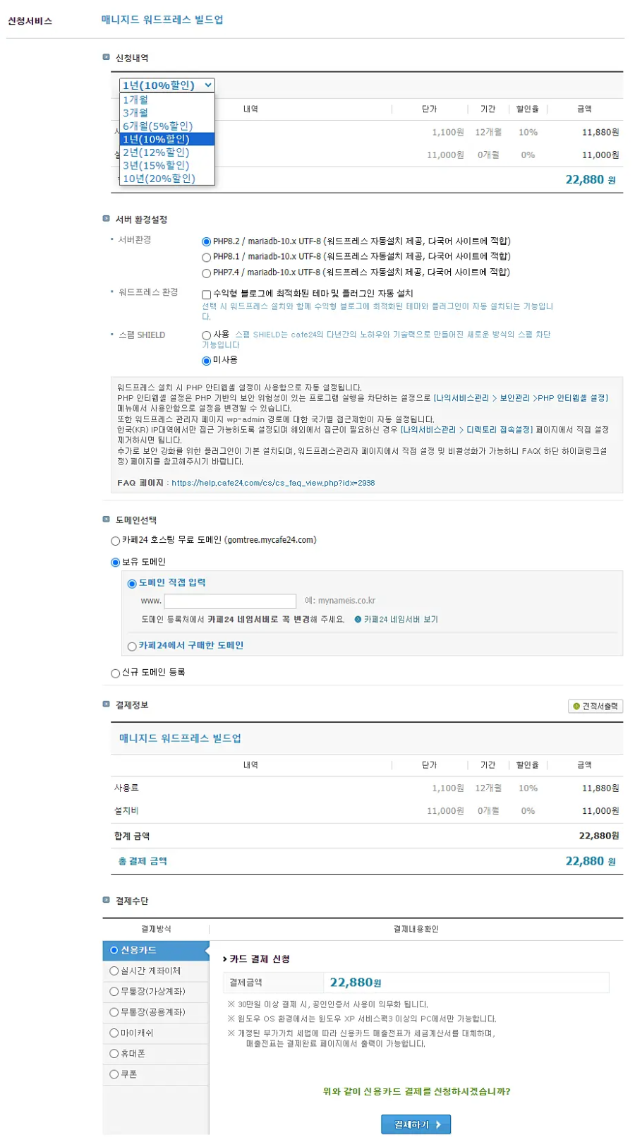 | 호스팅( =서버 ) | 카페24 | 22,880원 = 11,880원(1년) + 11,000원(설치비) |