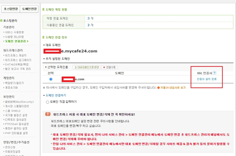 대표 도메인이 ???.mycafe24.com로 되어 있는 것을 확인할 수 있습니다. "추가 설정된 도메인" 리스트에 있는 가비아 도메인을 선택합니다. "ssl 인증서" 항목에 "인증서 설치 완료"가 아닌 다른 내용(요청, 재요청 등)의 버튼이 있다면 클릭해서 인증서요청을 합니다. 그리고 "대표도메인으로 변경"을 클릭합니다.
