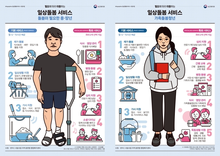 올해 하반기부터 질병, 부상, 고립 등으로 돌봄이 필요한 중장년(만40~64세)과 가족돌봄청년(만13~34세)을 대상으로 지원해 주는 서비스입니다. 돌봄.가사, 병원 동행, 심리지원 등을 통합 제공해 국민의 삶의 질을 한 단계 높이기 위한 정책의 일환으로 시행될 예정입니다.
