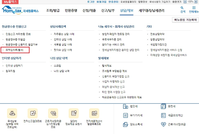 2. 상담/제보 > 현금영수증민원신고 > 주택임차료(월세) 순으로 들어갑니다
